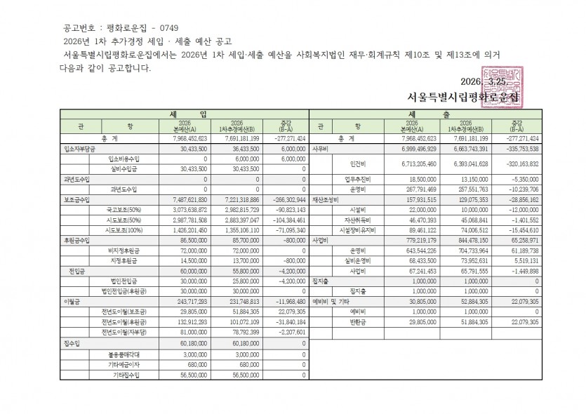 2026년 1차 추가경정 예산 공고 페이지 정보 작성자 한동주 작성일 26-03-25 16:51 조회 127회 댓글 0건 첨부파일 파일 홈페이지공고 .pdf (75.1K) 4회 다운로드 DATE : 2026-03-25 16:51:20 본문 이전글 다음글 목록 답변