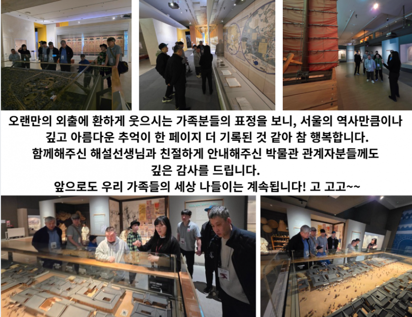 거주인 이야기 | 서울역사박물관 견학 페이지 정보 작성자 장설궁 작성일 26-04-03 17:37 조회 104회 댓글 0건 본문 살랑살랑 불어오는 봄바람을 타고, 우리 평화로운집 가족들은 서울의 역사가 살아 숨 쉬는 '서울역사박물관'으로 나들이를 다녀왔습니다.박물관 곳곳을 둘러보며 옛 서울의 풍경에 발길을 멈추기도 하고, "예전엔 이랬지~" 하며 정겨운 옛 기억을 소환해보기도 하는 뜻깊은 시간이었습니다. 세심하게 준비된 전시물들 덕분에 가족분들도 모두 편안하고 즐겁게 관람을 마칠 수 있었습니다. 다음글 목록