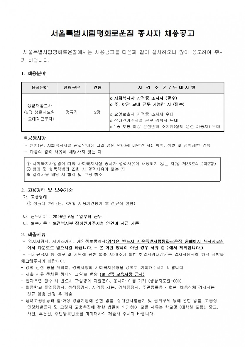 평화로운집 2025년 3차 종사자(생활지도원) 채용 공고 페이지 정보 작성자 한동주 작성일 25-05-02 14:08 조회 10,299회 댓글 0건 첨부파일 파일 2025년-생활지도원 3차.hwp (114.5K) 92회 다운로드 DATE : 2025-05-02 14:08:29 파일 시립평화로운집 입사지원서이력서,자기소개서및개인정보동의서.hwp (54.0K) 141회 다운로드 DATE : 2025-05-02 14:08:29 본문 평화로운집 2025년 3차 종사자(생활지도원) 채용을 다음과 같이 공고합니다. 이전글 다음글 목록 답변