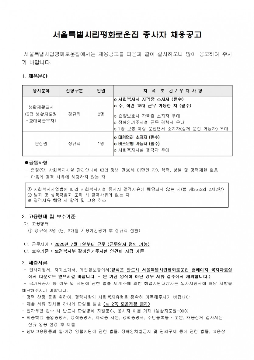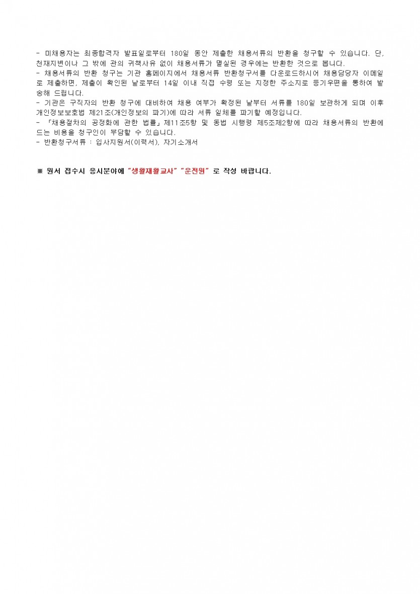제4차 직원채용 공고(생활지도원, 운전원) 페이지 정보 작성자 한동주 작성일 25-06-04 13:54 조회 9,354회 댓글 0건 첨부파일 파일 시립평화로운집 입사지원서이력서,자기소개서및개인정보동의서.hwp (54.0K) 147회 다운로드 DATE : 2025-06-04 13:54:21 파일 2025년 4차 운전원, 생활지도원.hwp (117.5K) 126회 다운로드 DATE : 2025-06-04 16:44:36 본문 이전글 다음글 목록 답변