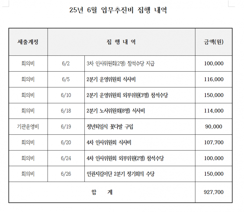 6월 업무추진비 내역공고 페이지 정보 작성자 한동주 작성일 25-07-04 17:35 조회 8,016회 댓글 0건 본문 6월 업무추진비를 다음과 같이 공고합니다. 이전글 다음글 목록 답변