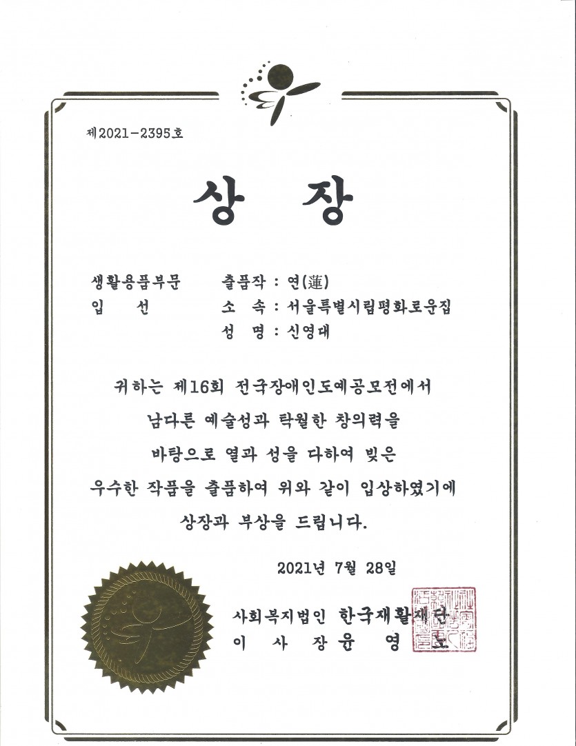 한국재활재단이 주최하고, 서대문장애인종합복지관에서 주관하는 제16회전국장애인도예공모전에서