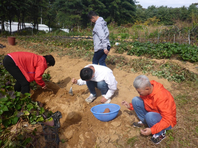 집 뒷마당 텃밭에서 처음 사용 해 보는 호미를 이용하여 고구마를 캐고, 쌈 채소 치커리도 뜯어서 돌아오는