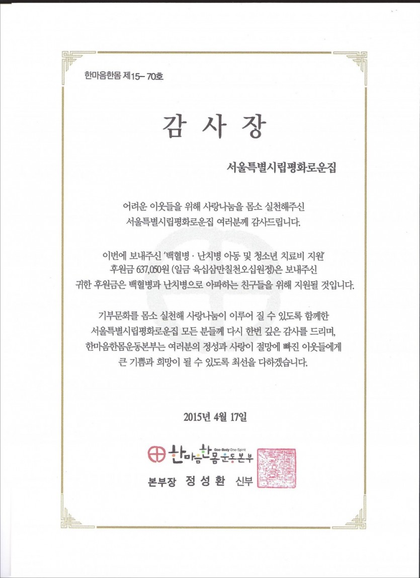 배건오 작성일한깨 100원 나눔 실천에 동참하신 평화로운집 가족여러분은 나누는 기쁨을 맛보았으며 사랑은 나눌수록 배가되는 참사랑을 통해 예수님 닮은 생활을 몸소 체험하셨으며 환우여러분들께도 따스한 사랑이 전달되었으리라 믿습니다.