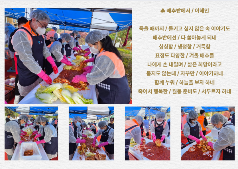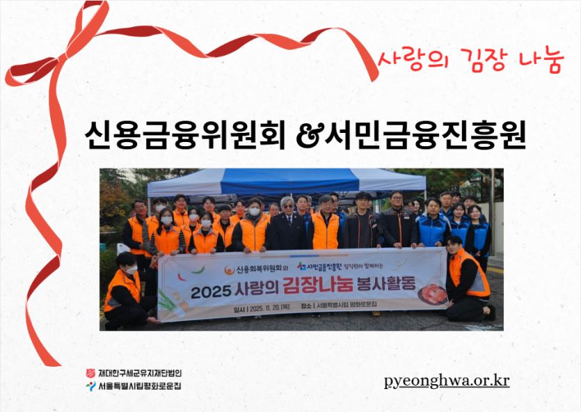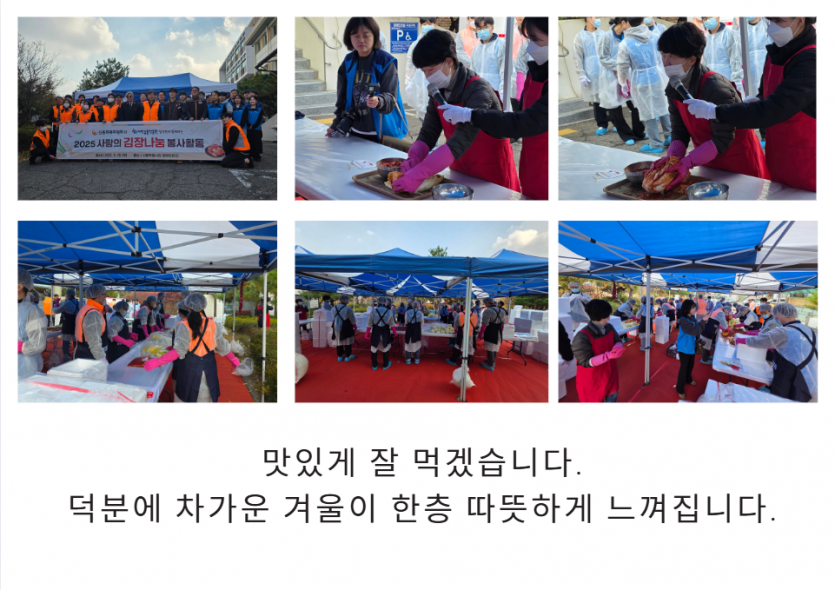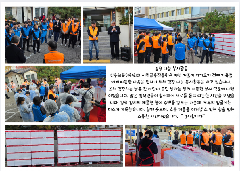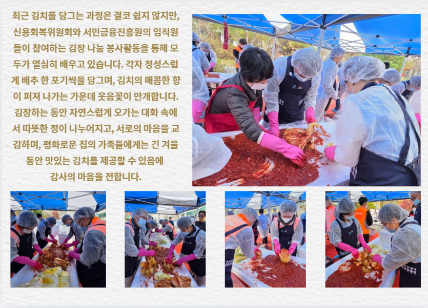 후원자·봉사자 이야기 | 신용회복위원회와 서민금융진흥원과 함께 하는 김장 페이지 정보 작성자 장설궁 작성일 25-11-26 11:16 조회 1,319회 댓글 0건 본문 신용회복위원회와 서민금융진흥원과 함께한 김장임직원분들께서 직접 김치를 담으며 가족분들이 겨울에 맛있게 드신다는 생각에 한 포기 한 포기 정성을 담아따뜻한 마음을 전해주셨습니다. 이 김치가 식탁에 오를 때마다 사랑이 깃든 이 따스함을잊지 않겠습니다. 함께해 주신 모든 분들께 다시 한 번 깊은 감사를 드립니다.고맙습니다.감사합니다. 이전글 다음글 목록