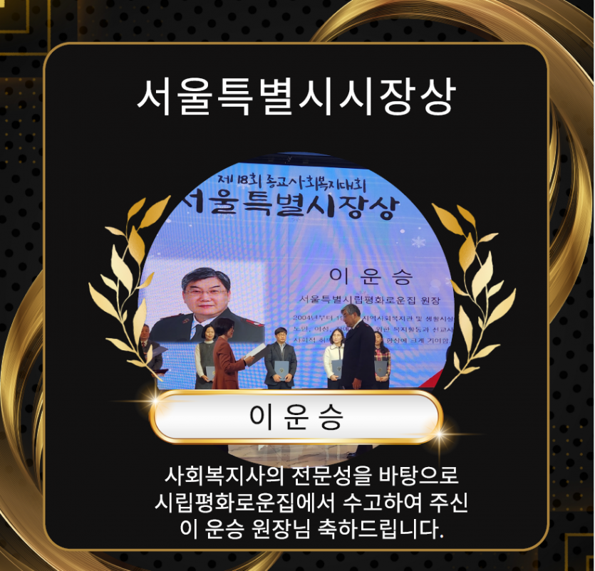 제18회 종교사회복지대회 서울특별시장상 페이지 정보 작성자 장설궁 작성일 24-01-10 11:51 조회 5,941회 댓글 0건 본문 지난 12월 27일 오후 4시 30분 서울 마포구 케이터틀에서 ‘제18회 종교사회복지대회’를 개최했습니다사회복지의 성장을 위해 헌신한 서울특별시립평화로운집 이운승 원장님께서 서울특별시시장상 수상하셨습니다. 축하드립니다. 이전글 다음글 목록