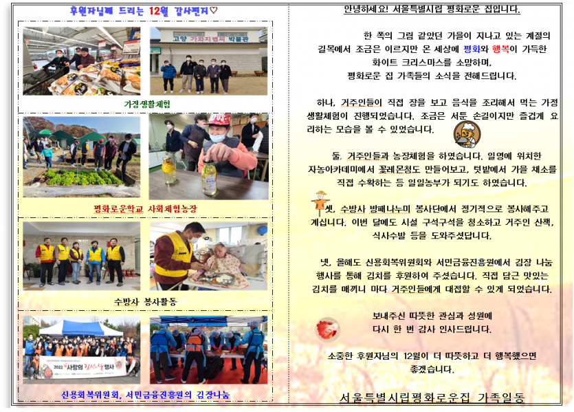 2022년 12월 후원감사편지 페이지 정보 작성자 장설궁 작성일 22-12-08 13:00 조회 10,527회 댓글 0건 본문 어느덧 2022년 한해를 마무리하는 마지막 달 12월이 되었습니다. 우리가 함께 해서 너무나 행복한 시간들 이었습니다.남은 시간을 아쉬워 하기보다는 채워가는 12월 보내시길 바랍니다. 소리 없이 세상을 하얗게 물들이는 하얀 눈처럼 조용히 찾아오는 일상에서 평온함이 가득하길 기원합니다. ♡ 이전글 다음글 목록
