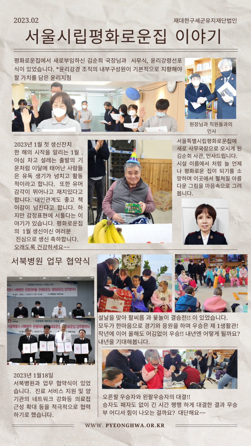 2023년 2월 후원감사편지 페이지 정보 작성자 장설궁 작성일 23-02-13 11:31 조회 10,492회 댓글 0건 본문 안녕하세요? 후원자님겨울 추위가 막바지에 다다른 2월 입니다. 아직 추위가 매섭지만 조금만 더 기다리면 봄이 온다는 생각에 기다림이 즐겁지 않으시나요?포근한 봄을 맞이하기 위해 건강 관리 잘 하시고 몸도 마음도 다가올 봄의 활력으로 가득 채워보시길 바라면서 ^^평화로운가족들의 이야기를 들려들입니다~~ 항상 행복 하세요♡ 이전글 다음글 목록