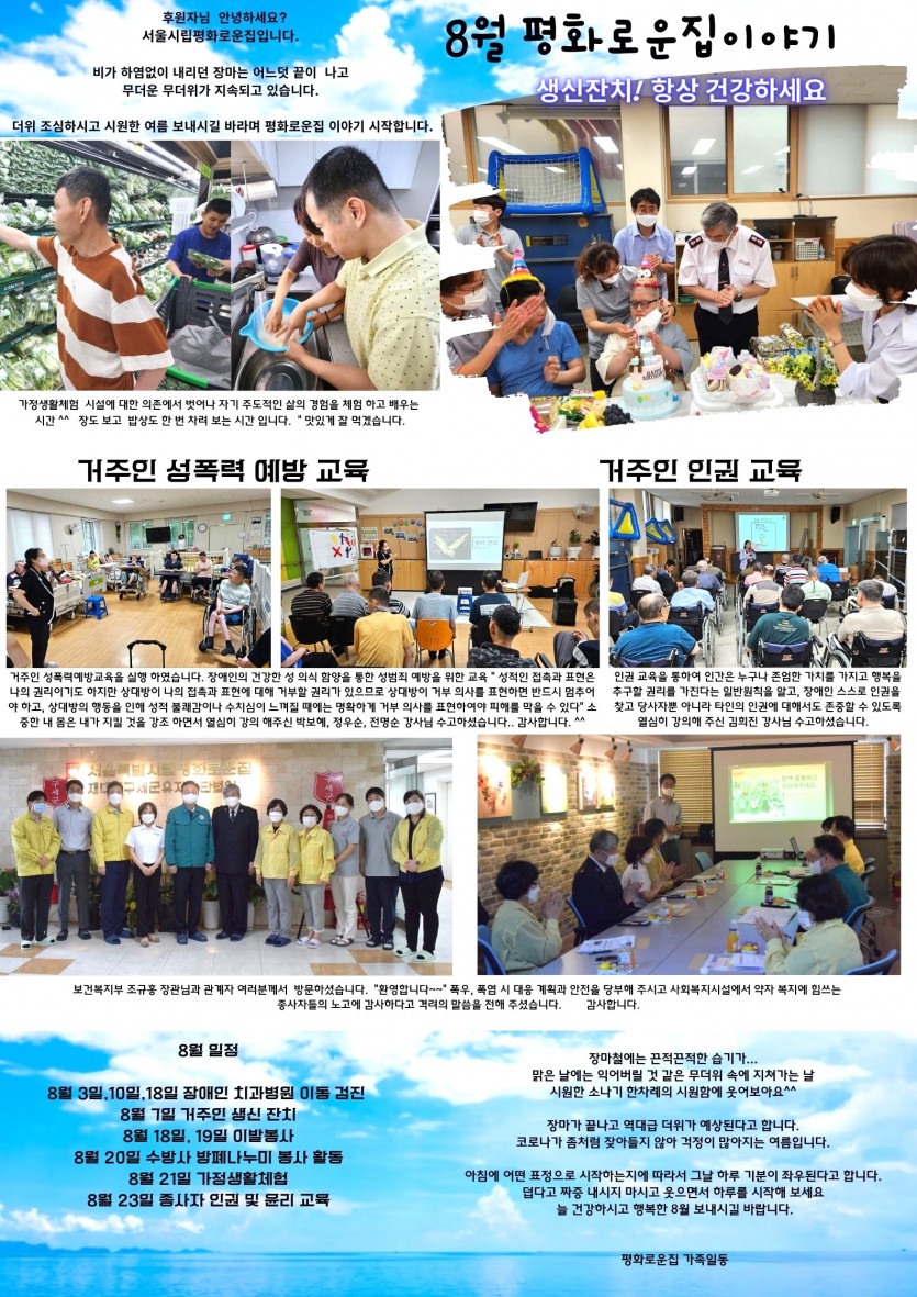 2023년 8월 후원감사편지 페이지 정보 작성자 장설궁 작성일 23-08-05 14:54 조회 8,045회 댓글 0건 본문 무더운 날씨가 연일 계속 이어지고 있지만 충분한 수분 섭취, 가벼운 운동 등으로건강 관리 잘 하셨으면 좋겠습니다. 항상 건강하시고 행복하시길 바라면서 8월 평화로운집 가족 이야기 시작 합니다^^ 이전글 다음글 목록