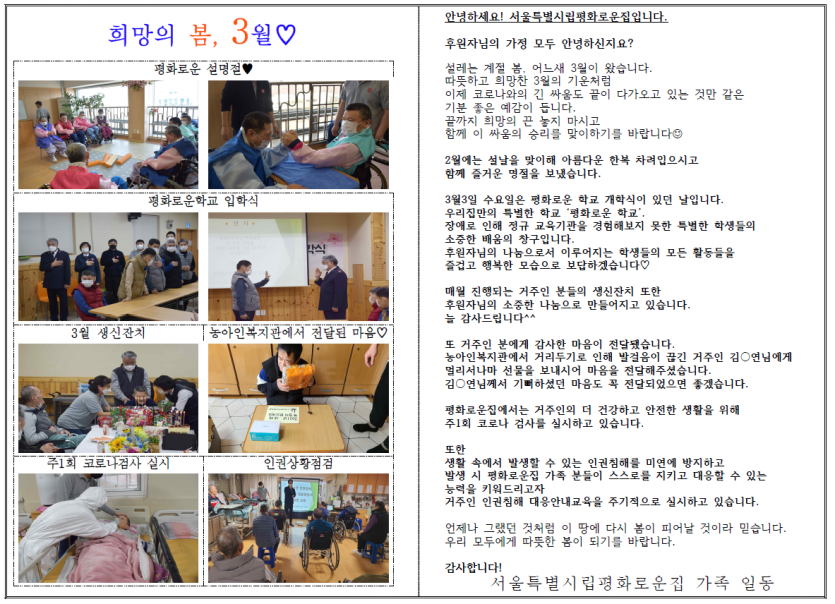 2021년 3월 후원자 감사편지 페이지 정보 작성자 박상은 작성일 21-04-06 13:48 조회 13,651회 댓글 0건 본문 2021년 3월, 후원자님의 마음과 같은 따뜻한 봄입니다.늘 나눔으로 함께해주시는 후원자님께감사의 편지를 올립니다. 이전글 다음글 목록