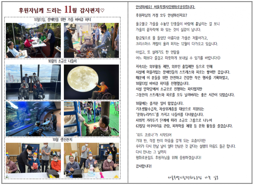 2021년 11월 후원자 감사편지 페이지 정보 작성자 박상은 작성일 21-11-18 10:04 조회 12,495회 댓글 0건 본문 첫눈이 내리는 가을입니다.11월, 후원자님께 감사의 편지를 올립니다. 이전글 다음글 목록