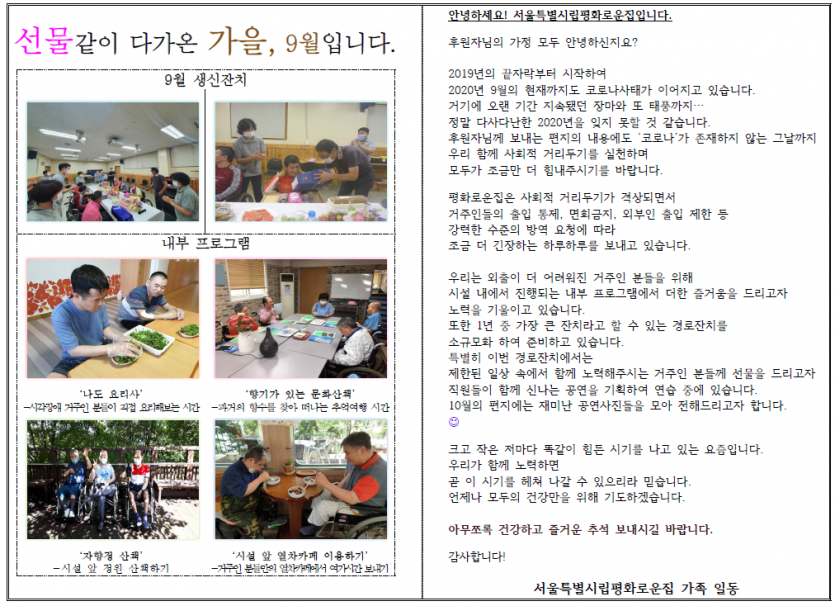 2020년 9월 후원자 감사편지 페이지 정보 작성자 박상은 작성일 20-09-11 15:57 조회 14,413회 댓글 0건 본문 2020년 9월, 아름다운 가을에 늘 나눔으로 함께해주시는 후원자님께감사의 편지를 올립니다. 이전글 다음글 목록
