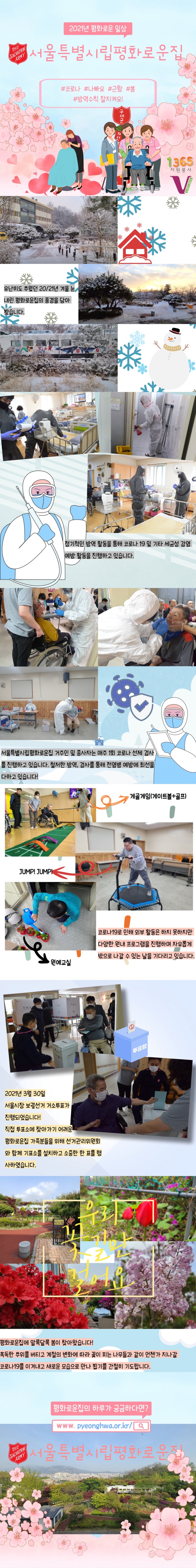서울특별시립평화로운집 4월 카드 뉴스! 페이지 정보 작성자 박성호 작성일 21-04-23 17:26 조회 16,532회 댓글 0건 본문 코로나19로 인해 오랜 기간 시립평화로운집을 방문하지 못한 봉사자님을 위해 최근 근황을 카드뉴스를 통해 전해 드리고자 합니다.앞으로 지속적으로 업로드될 예정이니 많은 관심 부탁드립니다~~ ^3^ 이전글 다음글 목록